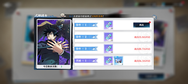 3、隨著你的戰(zhàn)力不斷提升,在式神副本中挑戰(zhàn)更高級的難度副本,可以獲得更高品質的式神碎片,每天挑戰(zhàn)的次數記得一定要完成,產出的材料性價比很高,就算花費鉆石完成也是必須的。