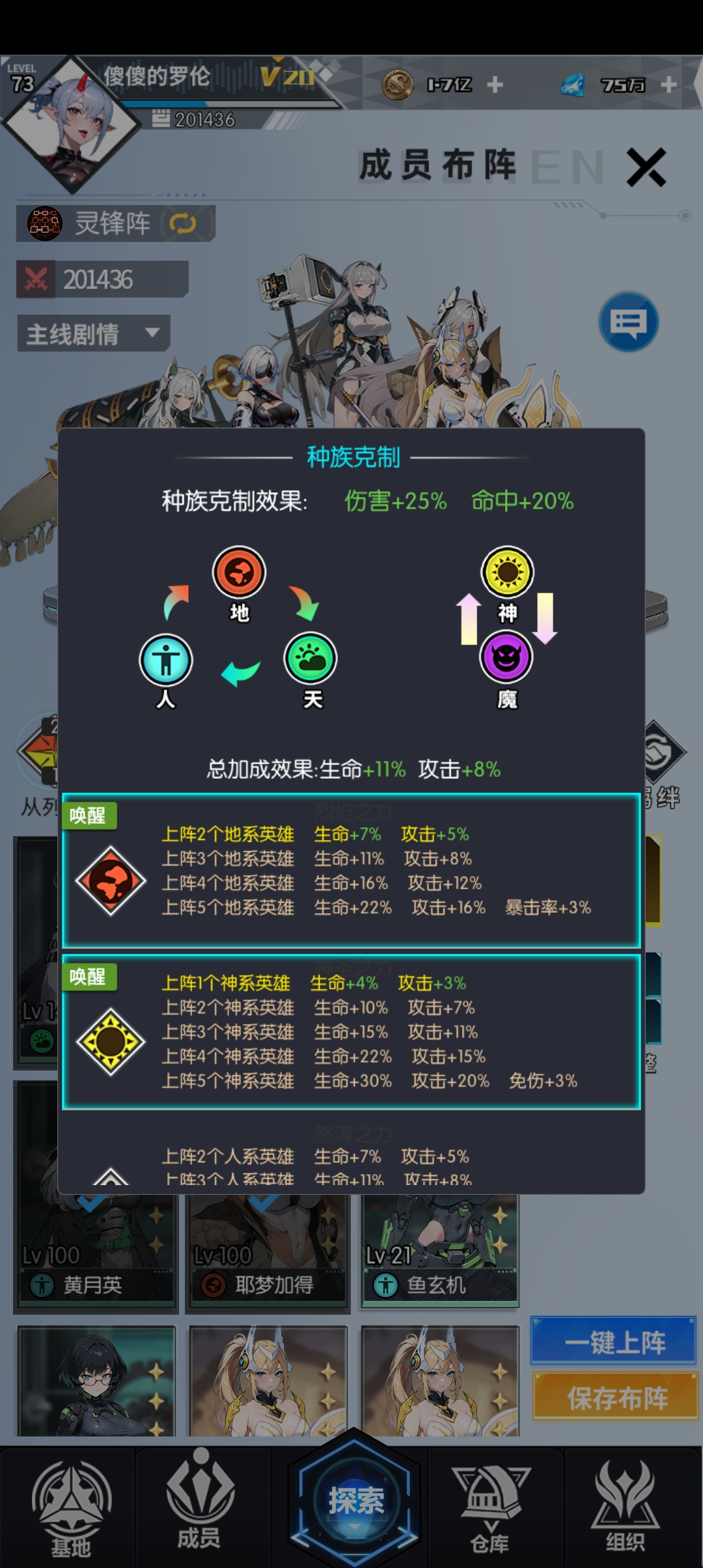 英雄分天、地、人及神、魔五個(gè)種族,種族之間有克制效果,部分英雄有羈絆加成;